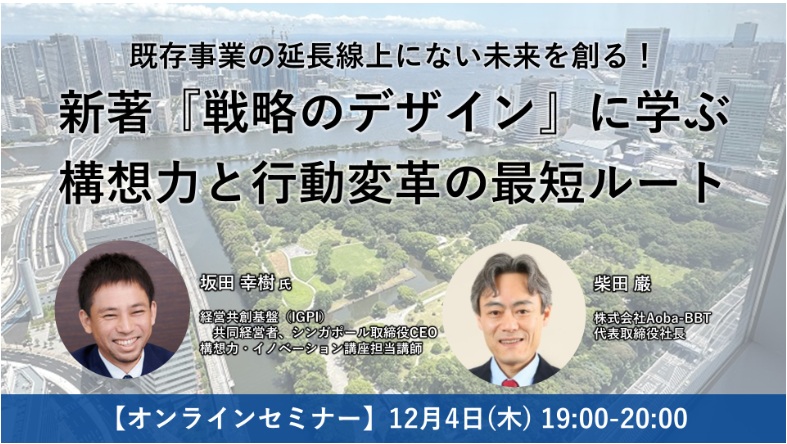 本セミナーでは、『戦略のデザイン ゼロから「勝ち筋」を導き出す10の問い』の著者であり、株式会社Aoba-BBTが提供する構想力・イノベーション講座で講師を務めるIGPIパートナー坂田 幸樹が、戦略と構想の関係性、そして 未来を描き実装するための思考法 をわかりやすく解説します。また、株式会社Aoba-BBT代表取締役社長の柴田 巌氏との対談では、 「アイデア発想 → 構想化 → イノベーション」につながる具体的なプロセス を取り上げ、変革の最短ルートを議論します。